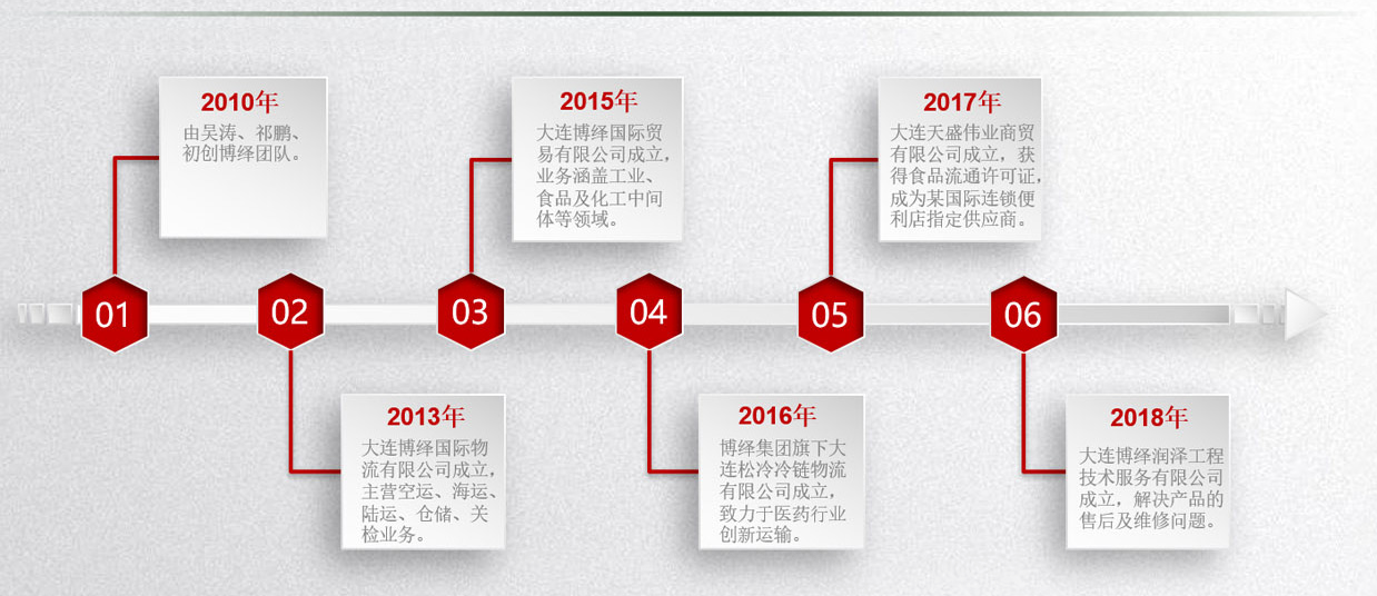 為更好地向客戶提供全球貨物流通服務,集團先后成立了大連博繹國際貿易有限公司、大連松冷冷鏈物流有限公司、大連天盛偉業商貿有限公司及大連博繹潤澤工程技術服務有限公司。在未來的發展中,集團將繼續為客戶提供專業服務,為員工實現自我價值,為社會和諧發展和文明進步做貢獻。